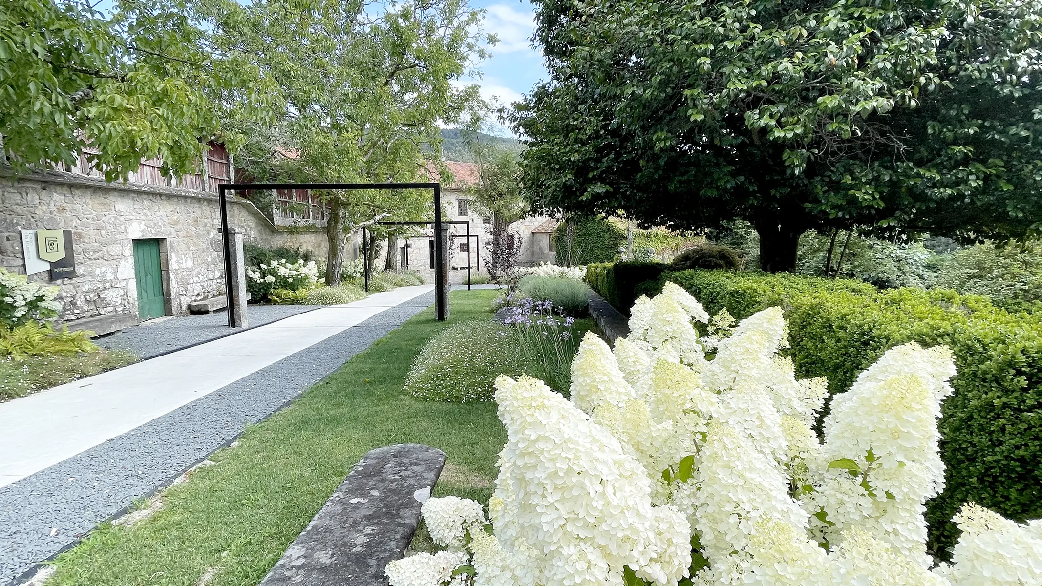 Es la parte del jardín que recibe al visitante y lo conduce hacia el edificio del pazo o hacia el renovado salón de celebraciones. Buscamos potenciar la presencia del agua, naturalmente existente en la finca, mediante la construcción de un canal que discurre en paralelo al camino. Su movimiento y sonoridad son antesala del regato que nos encontraremos en la parte baja de la parcela.